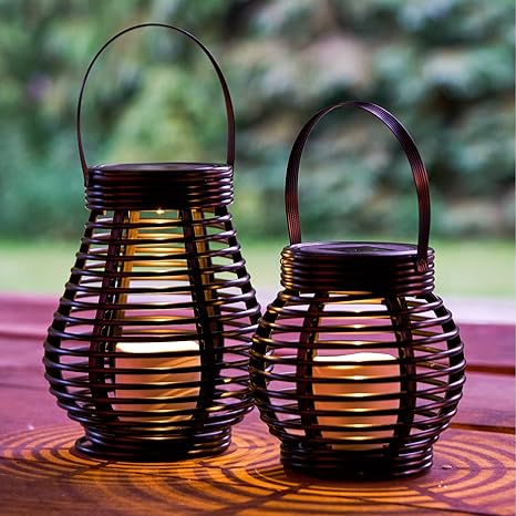 Globrite Set Of 2 Rattan Solar Powered Led Garden Lanterns Round