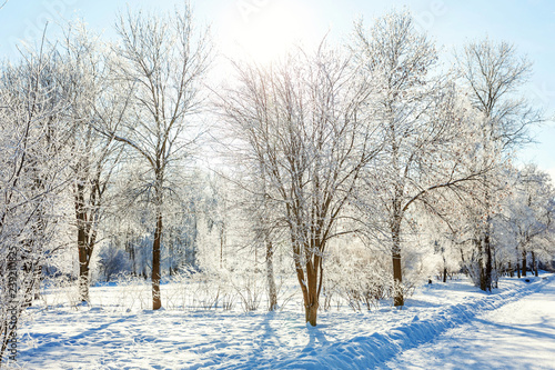 Frosty Trees In Snowy Forest Cold Weather In Sunny Morning Stock